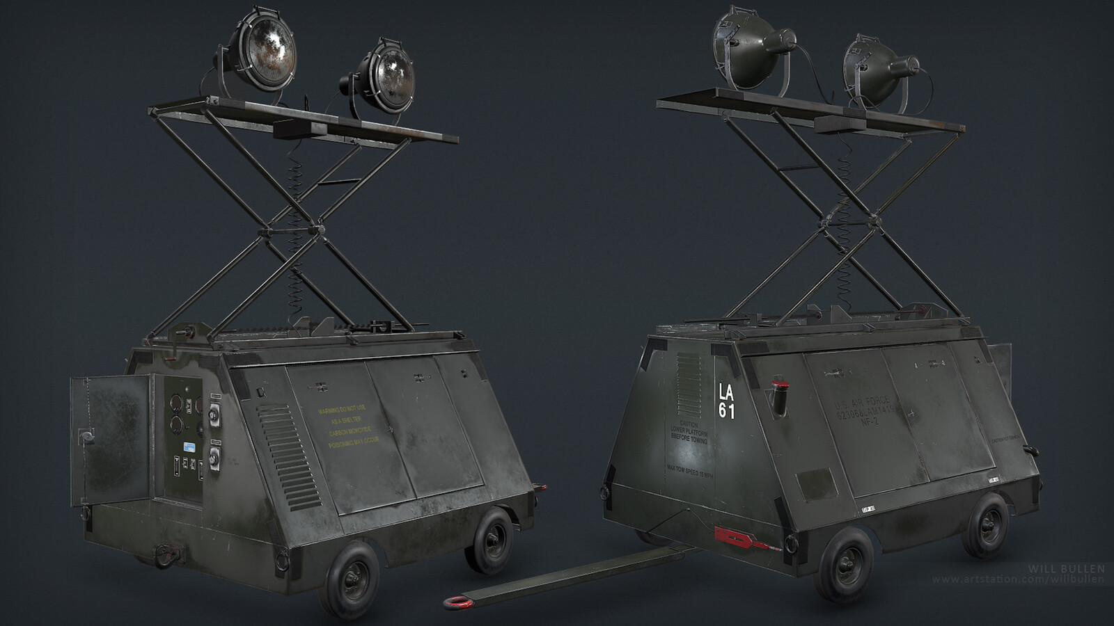 A game prop of an NF-2 Lighting Unit. A mobile generator with floodlights used to illuminate air bases and power other equipment, used by the USAF during the Vietnam War.