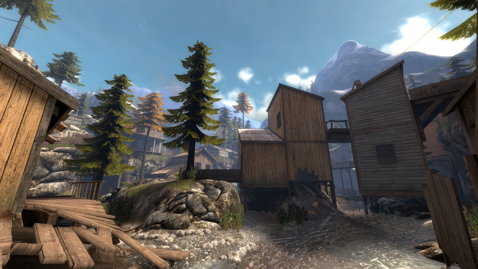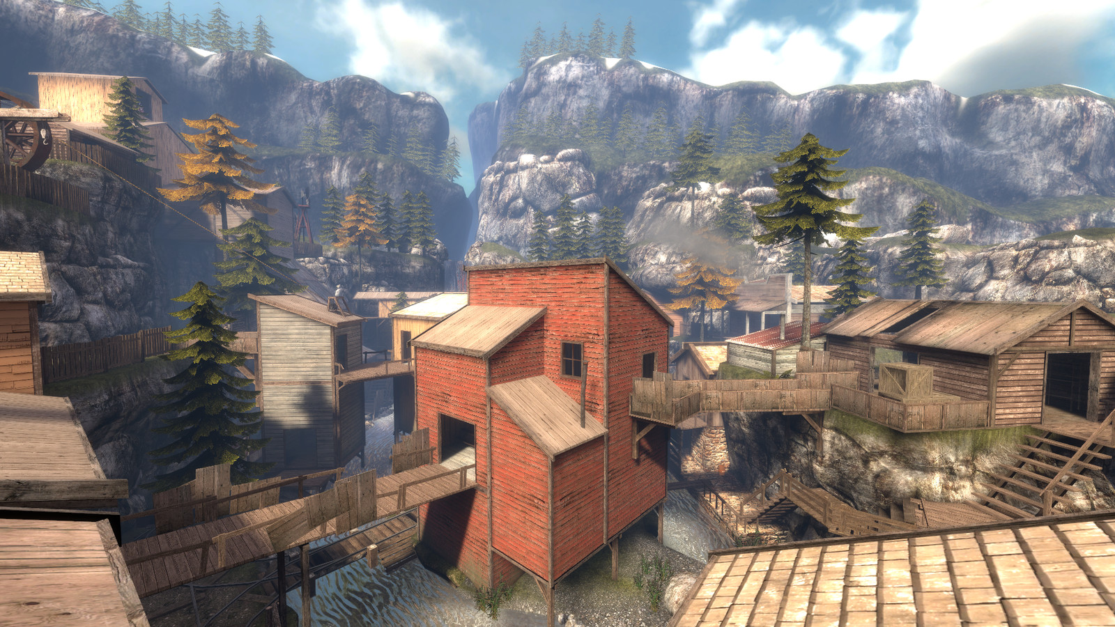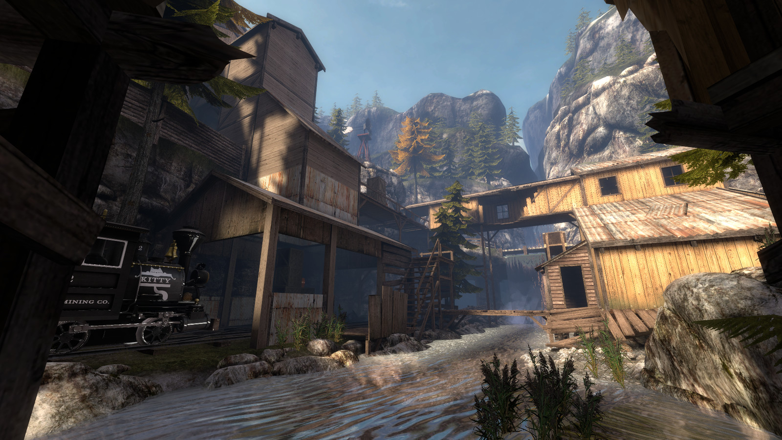 Cripplecreek is set in a rocky valley, it has a lot of height variation and a mix of long range and close quarter combat areas. Running around the map is a driveable train which becomes the focal point for chaotic fighting to gain control over it, It even has a usable whistle in the cabin.