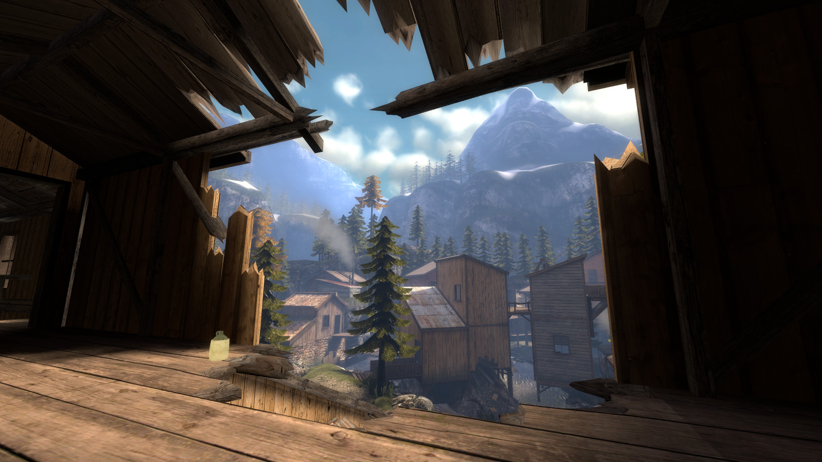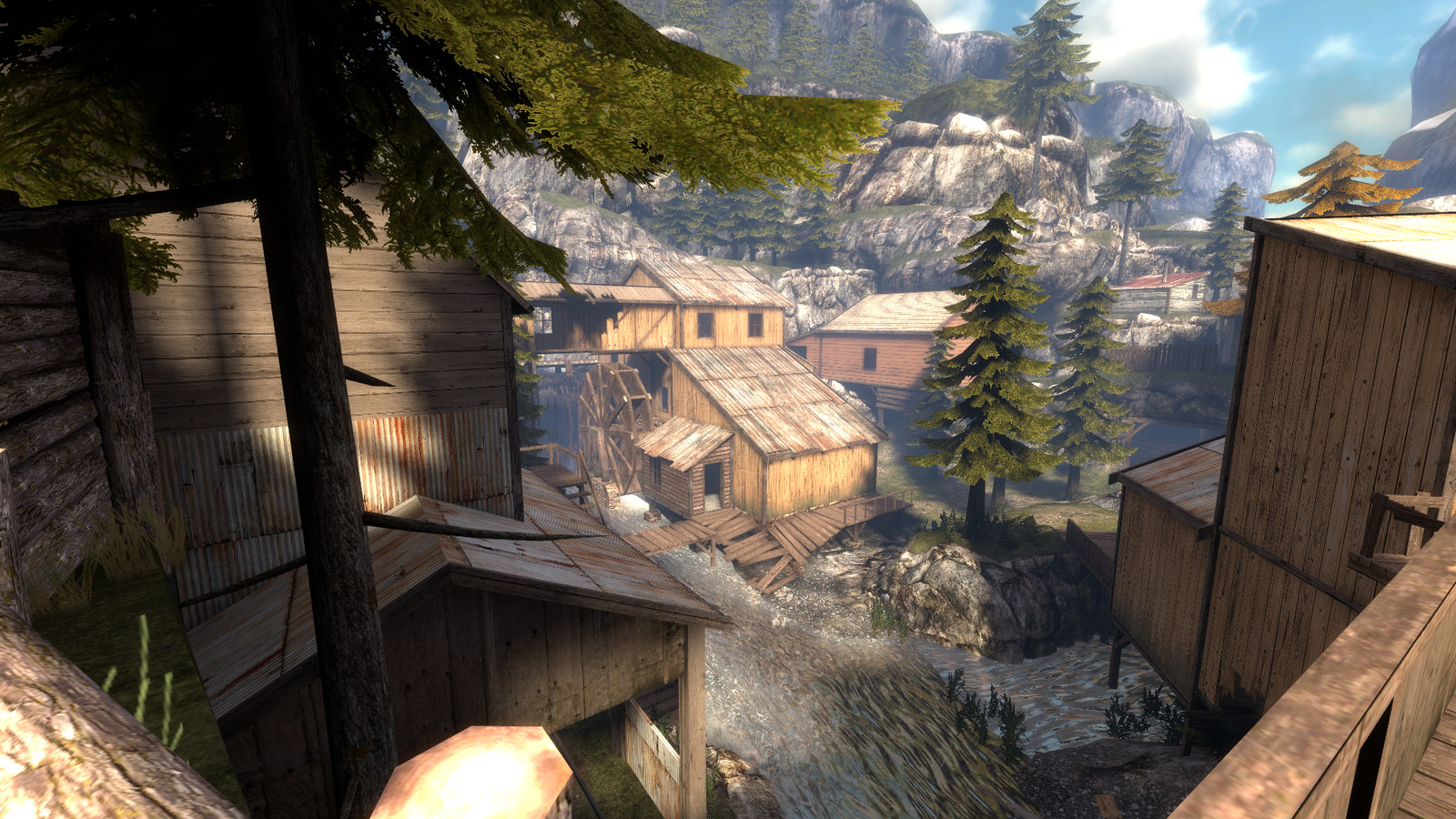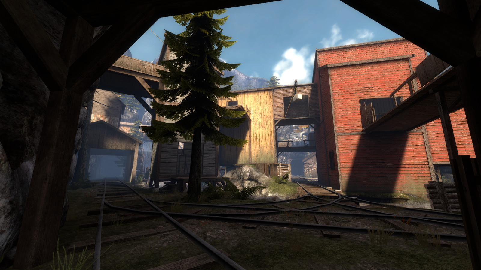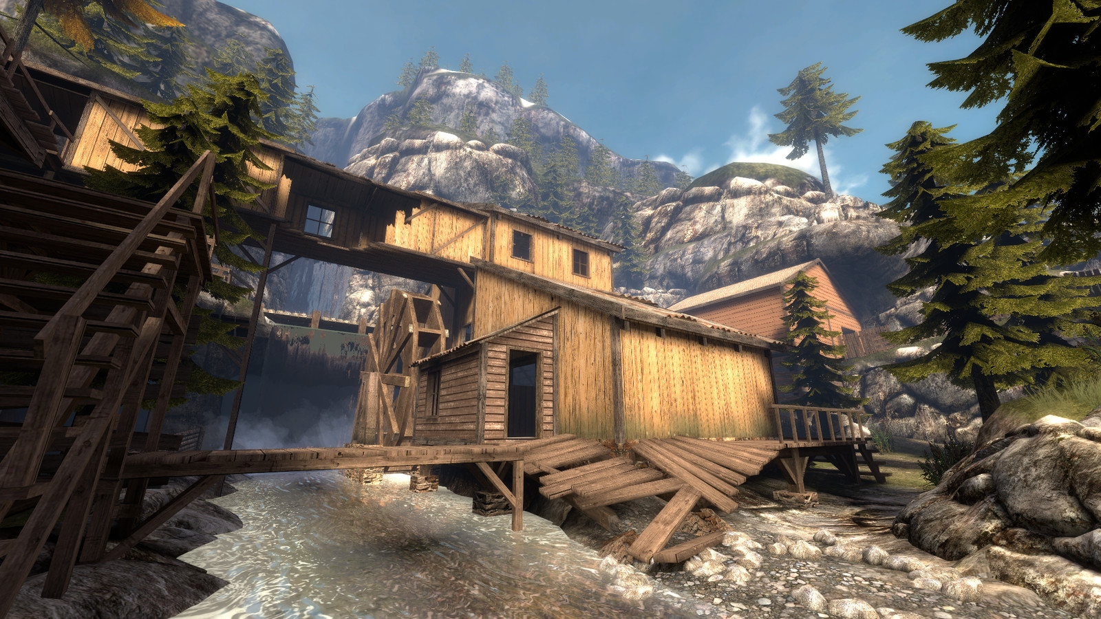 Cripplecreek is set in a rocky valley, it has a lot of height variation and a mix of long range and close quarter combat areas. Running around the map is a driveable train which becomes the focal point for chaotic fighting to gain control over it, It even has a usable whistle in the cabin.